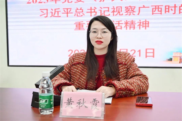 黨委委員、學(xué)生工作處副處長李麗詩作題為《奮力譜寫中國式現(xiàn)代化廣西篇章——學(xué)習(xí)習(xí)近平總書記視察廣西時(shí)的重要講話精神》的主題發(fā)言。