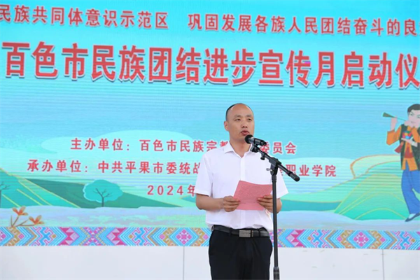 陳玉榮調(diào)研員最后宣布2024年百色市民族團(tuán)結(jié)進(jìn)步宣傳月啟動(dòng)。