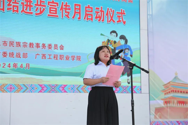 黨委副書記、校長(zhǎng)羅艷妮在致辭中向出席啟動(dòng)儀式的各位領(lǐng)導(dǎo)和嘉賓表示歡迎,向關(guān)心支持廣西工程職業(yè)學(xué)院民族團(tuán)結(jié)進(jìn)步事業(yè)的各級(jí)領(lǐng)導(dǎo)、各界人士和積極投身民族團(tuán)結(jié)進(jìn)步事業(yè)創(chuàng)建的廣大干部群眾、師生員工表示感謝。