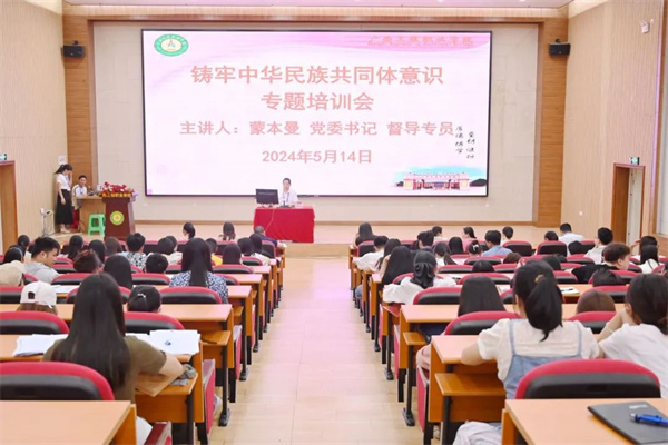 為不斷深化全校民族團(tuán)結(jié)進(jìn)步教育,鑄牢中華民族共同體意識(shí),5月14日下午,我校在圖文信息大樓一樓學(xué)術(shù)報(bào)告廳舉行鑄牢中華民族共同體意識(shí)專題培訓(xùn)會(huì)。紀(jì)委書記、副校長(zhǎng)彭高彬,黨委副書記黃秋霞,各黨組織書記,各部門負(fù)責(zé)人、行政人員及專任教師代表400余人參加。黨委書記、督導(dǎo)專員蒙本曼作專題培訓(xùn)。