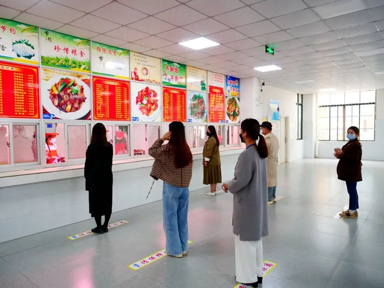 食堂工作人員在中午放學前在飯?zhí)瞄T口執(zhí)勤并且組織學生先洗手,從正門有序排隊量體溫,學生隔開入座就餐。就餐時摘掉舊口罩放至醫(yī)療垃圾桶,餐后清理桌面,并帶上新口罩。