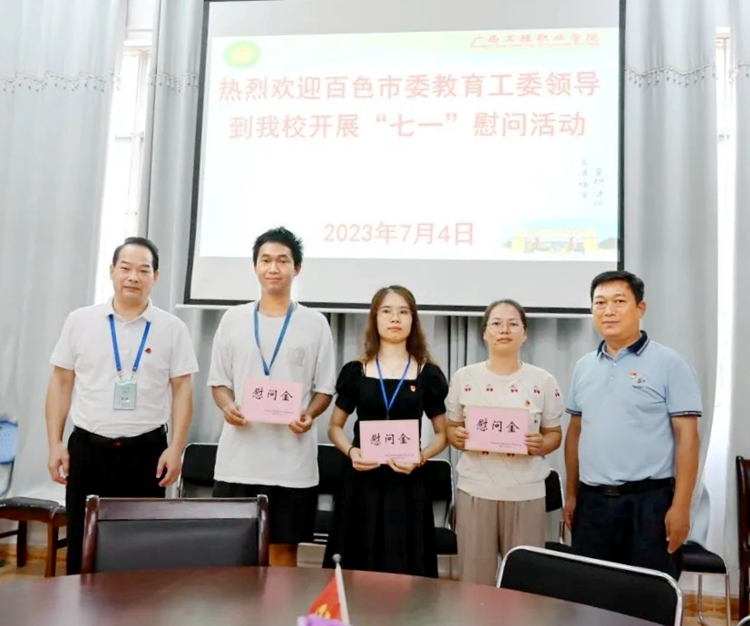 在中國共產(chǎn)黨建黨102周年之際,為加強(qiáng)黨內(nèi)關(guān)懷,傳遞組織溫暖,進(jìn)一步弘揚(yáng)黨的光榮傳統(tǒng)和優(yōu)良作風(fēng),7月4日,百色市委教育工委委員、市教育局黨組成員、總督學(xué)梁富文和市教育督導(dǎo)中心副主任王小東到我校開展“七一”慰問困難黨員活動,送上節(jié)日的慰問和誠摯的祝福。學(xué)校黨委班子成員陪同慰問。