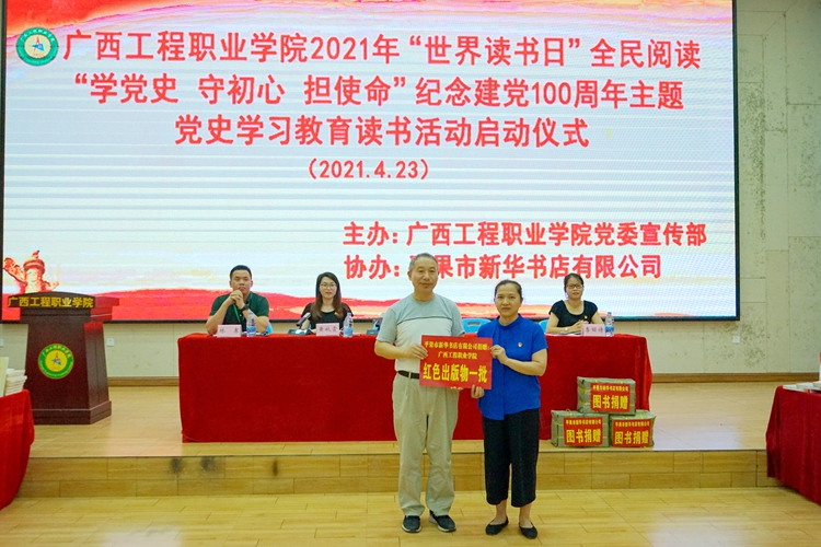 為慶祝中國共產(chǎn)黨成立100周年,創(chuàng)新黨史學(xué)習(xí)教育形式,持續(xù)做好中華優(yōu)秀文化傳承,推動全民閱讀深入大學(xué)校園,在青年學(xué)生中形成“愛讀書、讀好書、善讀書”的風(fēng)尚,營造書香校園氛圍,引導(dǎo)青年學(xué)生傳承紅色基因、牢記初心使命,“學(xué)史明理、學(xué)史增信、學(xué)史崇德、學(xué)史力行”, 4月23日,學(xué)校在圖文信息大樓報告廳舉行廣西工程職業(yè)學(xué)院2021年“世界讀書日”全民閱讀暨“學(xué)黨史 守初心 擔(dān)使命”紀(jì)念建黨100周年主題黨史學(xué)習(xí)教育讀書活動啟動儀式。