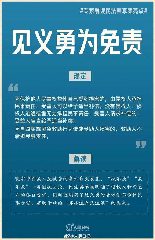 解讀:現(xiàn)實(shí)中因救人反被告的事件多次發(fā)生,“扶不扶”“救不救”一度困擾公眾。民法典草案明確了侵權(quán)人和受益人的各自責(zé)任,同時也明確了見義勇為者依法不承擔(dān)民事責(zé)任,有助于杜絕“英雄流血又流淚”的現(xiàn)象。