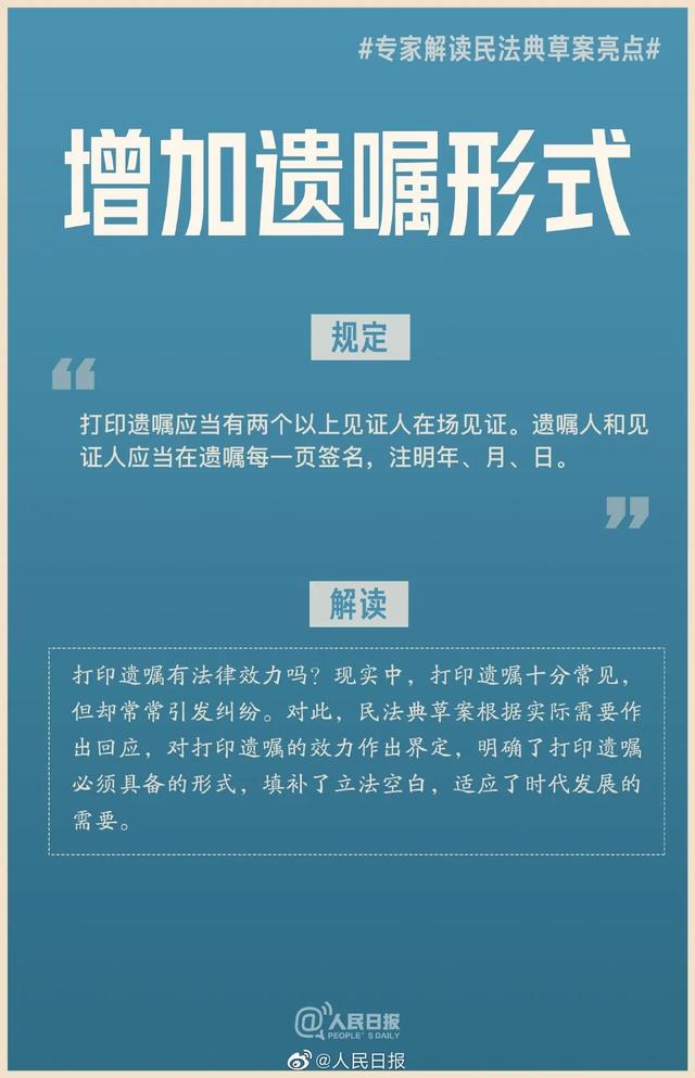 解讀:打印遺囑有法律效力嗎?現(xiàn)實(shí)中,打印遺囑十分常見,但卻常常引發(fā)糾紛。對此,民法典草案根據(jù)實(shí)際需要作出回應(yīng),對打印遺囑的效力作出界定,明確了打印遺囑必須具備的形式,填補(bǔ)了立法空白,適應(yīng)了時代發(fā)展的需要。