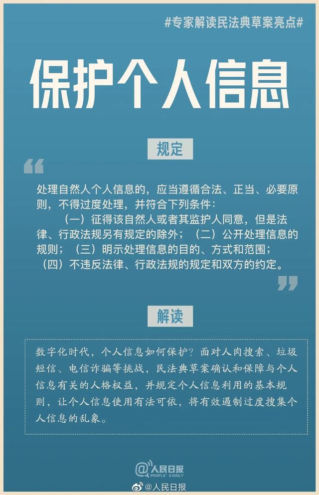 解讀:數(shù)字化時代,個人信息如何保護(hù)?面對人肉搜索、垃圾短信、電信詐騙等挑戰(zhàn),民法典草案確認(rèn)和保障與個人信息有關(guān)的人格權(quán)益,并規(guī)定個人信息利用的基本規(guī)則,讓個人信息使用有法可依,將有效遏制過度搜集個人信息的亂象。