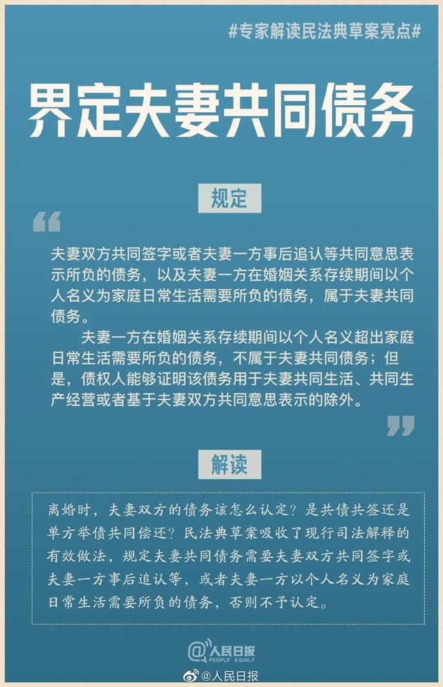 解讀:離婚時,夫妻雙方的債務(wù)該怎么認(rèn)定?是共債共簽還是單方舉債共同償還?民法典草案吸收了現(xiàn)行司法解釋的有效做法,規(guī)定夫妻共同債務(wù)需要夫妻雙方共同簽字或夫妻一方事后追認(rèn)等,或者夫妻一方以個人名義為家庭日常生活需要所負(fù)的債務(wù),否則不予認(rèn)定。