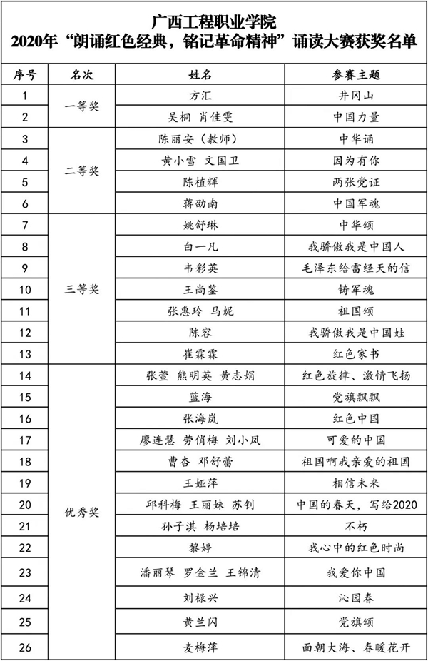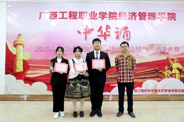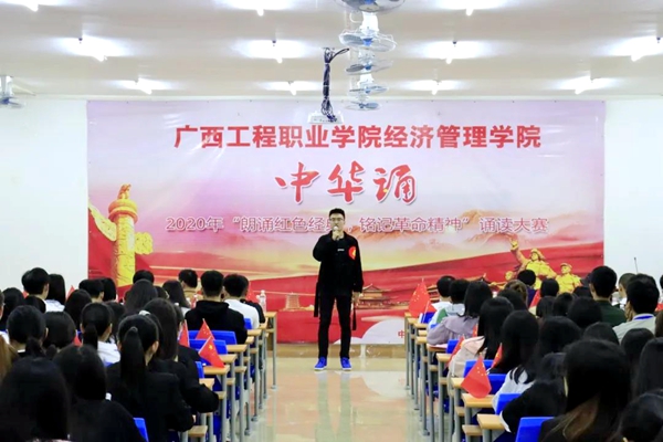 今年是建黨99周年,為繼承和發(fā)揚黨的光榮傳統(tǒng),增強紅色文化對青年大學(xué)生的吸引力、感召力,凝聚革命精神力量,厚植愛國情懷,傳遞“信仰、信念、信任、信守、自信”的正能量,11月19日晚,我校經(jīng)濟(jì)管理學(xué)院在實訓(xùn)樓102室舉辦2020年“朗誦紅色經(jīng)典,銘記革命精神” 主題誦讀大賽決賽。