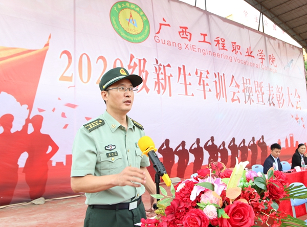 平果市大學園區(qū)黨工委書記、管理服務(wù)中心黨組書記楊敏捷講話,他首先對圓滿完成軍訓任務(wù)的我校2020級學子表示祝賀,向長期以來支持我校國防教育工作的廣西三軍國防教育基地學生軍訓教官表示感謝。