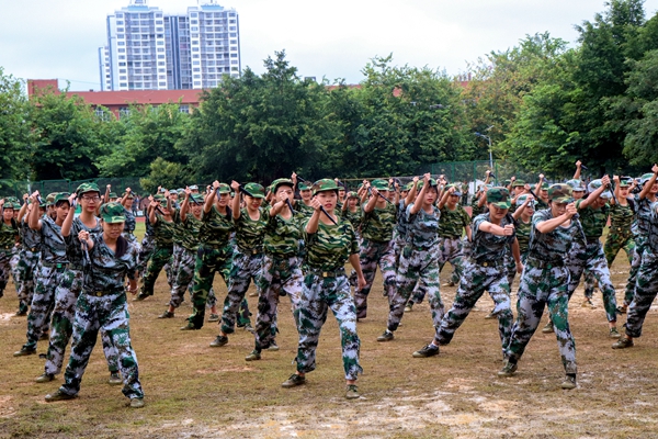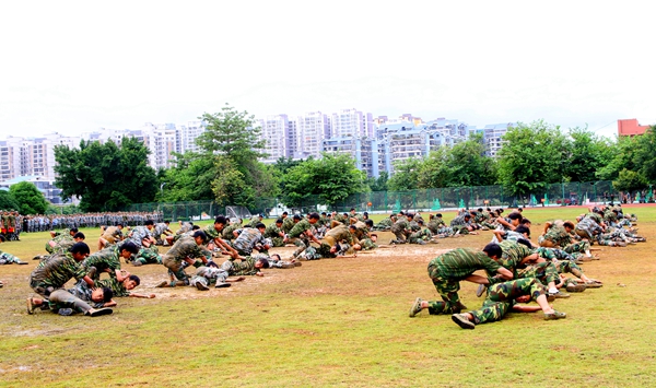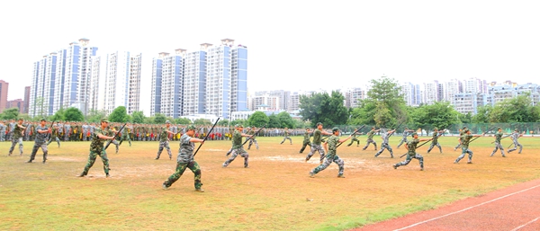 緊接著,激動人心的棍術(shù)、擒敵拳、匕首操、手語操、作戰(zhàn)戰(zhàn)術(shù)等軍事訓練項目在觀眾的期待中火熱上演,同學們矯健的身姿,高亢嘹亮的口號、整齊劃一的動作,充分展示了他們的意氣風發(fā)和壯志豪情,充分展現(xiàn)了他們經(jīng)過軍訓洗禮后的喜人收獲與成果。