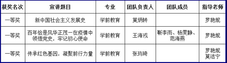 經(jīng)認(rèn)真評(píng)選,最終評(píng)選出一等獎(jiǎng)3名、二等獎(jiǎng)8名、三等獎(jiǎng)20名?!缎轮袊鐣?huì)主義發(fā)展史》、《百年恰是風(fēng)華正茂—在疫情中領(lǐng)悟黨史,牢記初心使命》、《傳承紅色基因,凝聚前行力量》等3個(gè)團(tuán)隊(duì)榮獲一等獎(jiǎng);《新中國史之中華人民共和國的成立》、《學(xué)黨史、感黨恩、跟黨走》等5個(gè)參賽團(tuán)隊(duì)榮獲二等獎(jiǎng);《弘揚(yáng)長征精神,走好新長征路》、《一葉紅船,百年崢嶸》等20個(gè)團(tuán)隊(duì)榮獲三等獎(jiǎng)。祝賀同學(xué)們?nèi)〉脙?yōu)異成績。