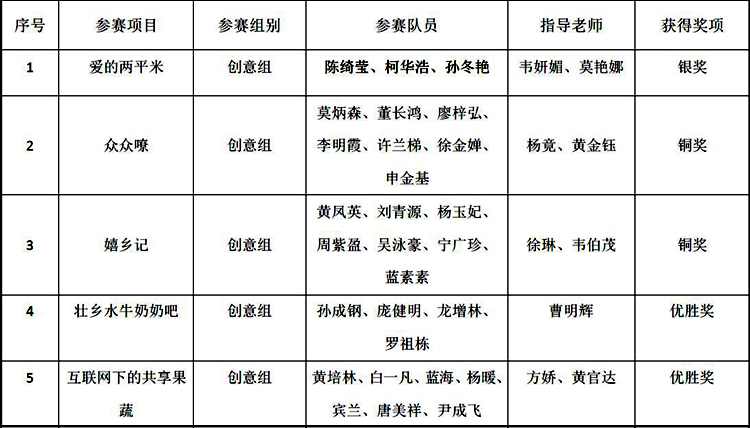 附:廣西工程職業(yè)學(xué)院榮獲平果大學(xué)園區(qū)第五屆“互聯(lián)網(wǎng)+”大學(xué)生創(chuàng)新創(chuàng)業(yè)大賽決賽名單