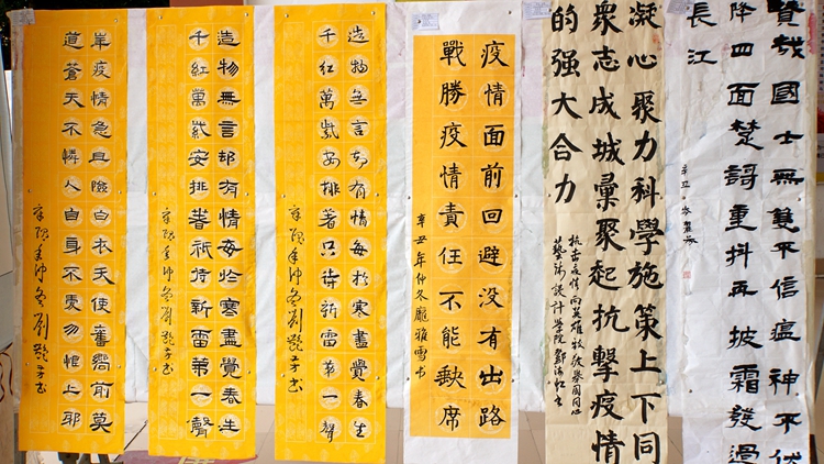 當(dāng)前,新型冠狀病毒肺炎疫情形勢依然嚴(yán)峻,疫情防控行動還在繼續(xù),12月20日18晚,我校藝術(shù)設(shè)計學(xué)院和瀚陽書法協(xié)會在魯班廣場聯(lián)合舉辦“抗擊疫情、筆尖有道”書畫展,工程學(xué)子們用畫筆謳歌抗“疫”英雄,禮贊抗“疫”事跡,為抗擊疫情助力,為中國加油!