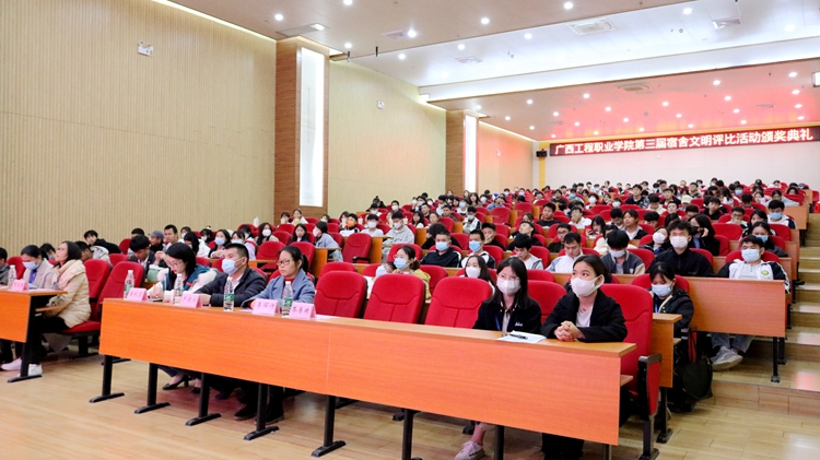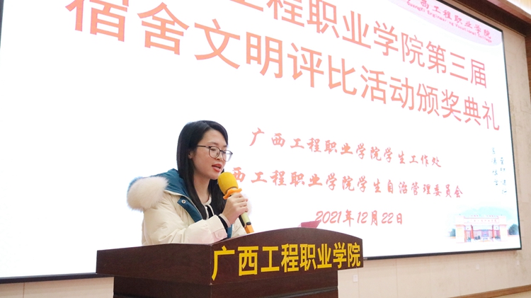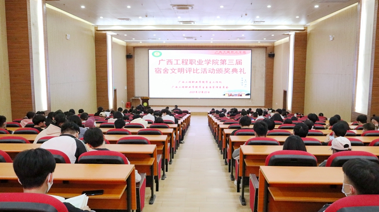 2021年12月22日晚,第三屆宿舍文明評(píng)比活動(dòng)頒獎(jiǎng)典禮在圖文信息樓一樓學(xué)術(shù)報(bào)告廳舉行,學(xué)校校長(zhǎng)助理黃秋霞、覃清香,學(xué)生工作處副處長(zhǎng)盧保日,各二級(jí)學(xué)院(部)負(fù)責(zé)人、分團(tuán)委書記等出席典禮,各二級(jí)學(xué)院輔導(dǎo)員以及學(xué)生代表參加頒獎(jiǎng)典禮。