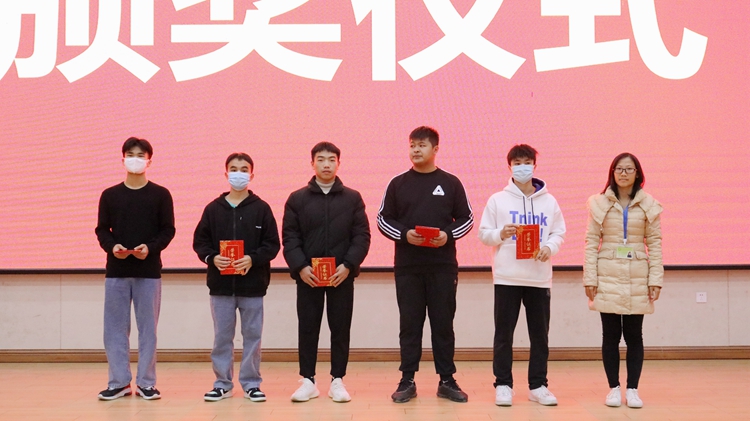 學(xué)生工作處副處長(zhǎng)盧保日為榮獲三等獎(jiǎng)的文明宿舍代表頒獎(jiǎng)