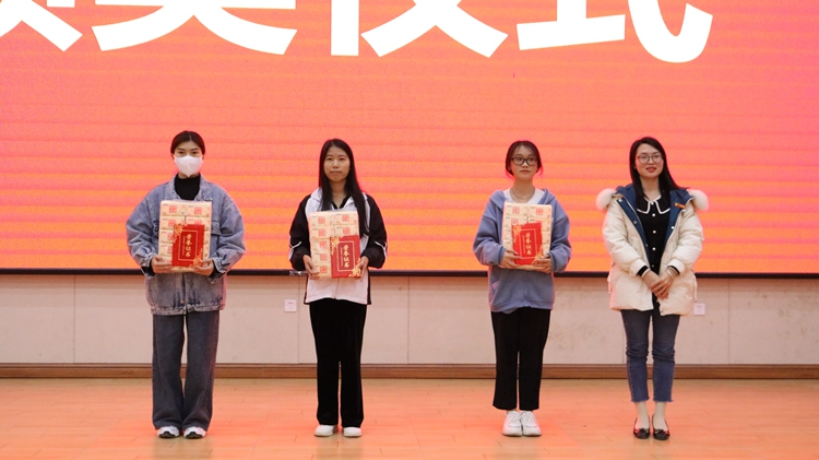 校長(zhǎng)助理黃秋霞為榮獲一等獎(jiǎng)的文明宿舍代表頒獎(jiǎng)