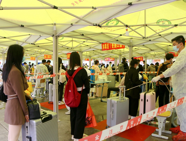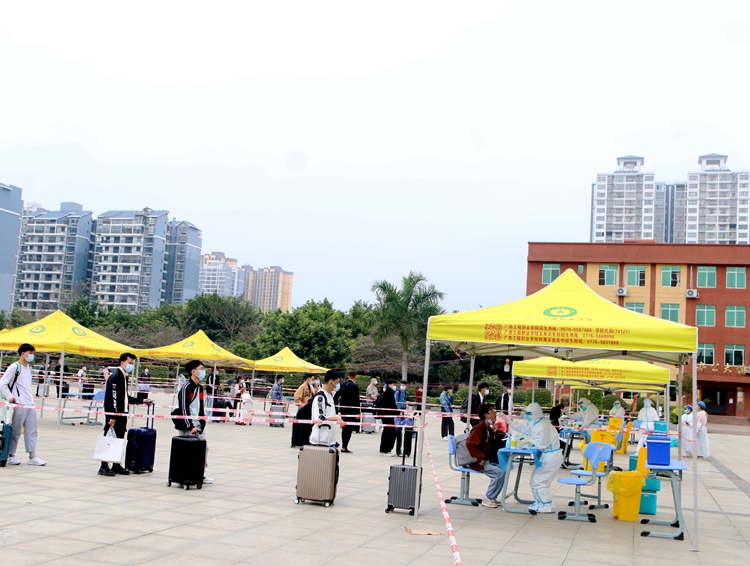 開學(xué)返校期間,學(xué)校門口設(shè)置隔離通道,工作人員引導(dǎo)學(xué)生間隔1米安全距離有序排隊(duì),經(jīng)行李消殺、核驗(yàn)48小時(shí)核酸檢測陰性證明、大數(shù)據(jù)行程卡、健康碼、更換口罩、體溫檢測、返校材料核驗(yàn)等一切正常后登記注冊,學(xué)生進(jìn)入校園,在工作人員的引導(dǎo)下,有序到魯班廣場進(jìn)行核酸檢測,隨后前往宿舍區(qū),由公寓管理員再次為學(xué)生測溫后辦理入住手續(xù)。整個(gè)流程有條不紊,報(bào)到現(xiàn)場秩序井然。