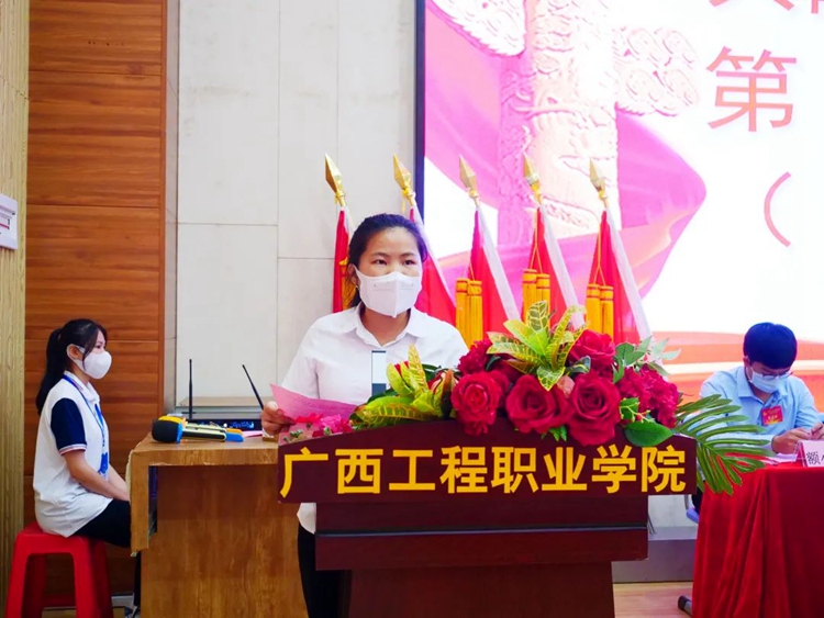 教育學(xué)院分團(tuán)委書記盧燕梅宣讀《關(guān)于中國共產(chǎn)主義青年團(tuán)廣西工程職業(yè)學(xué)院第五次代表大會工作報(bào)告的決議》(草案)
