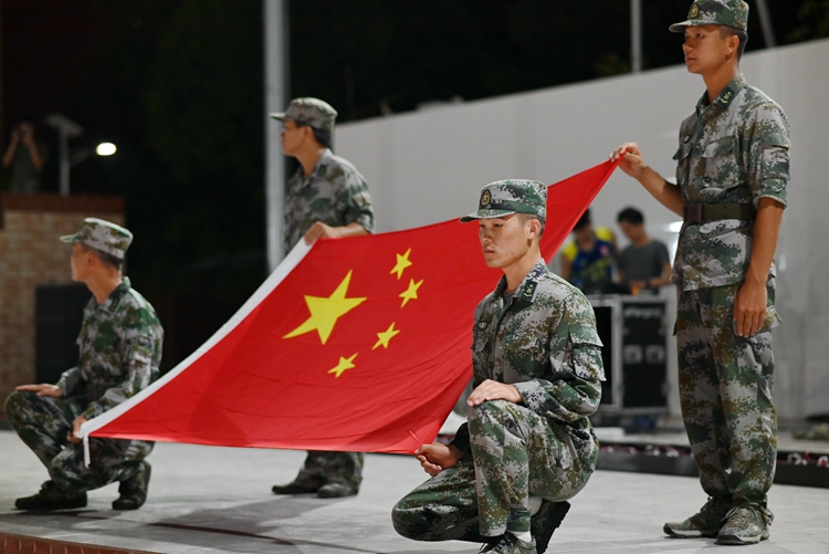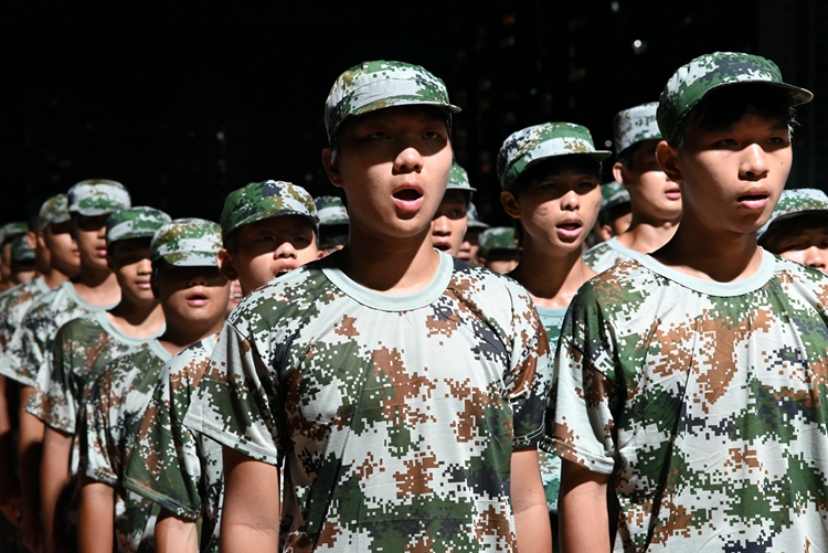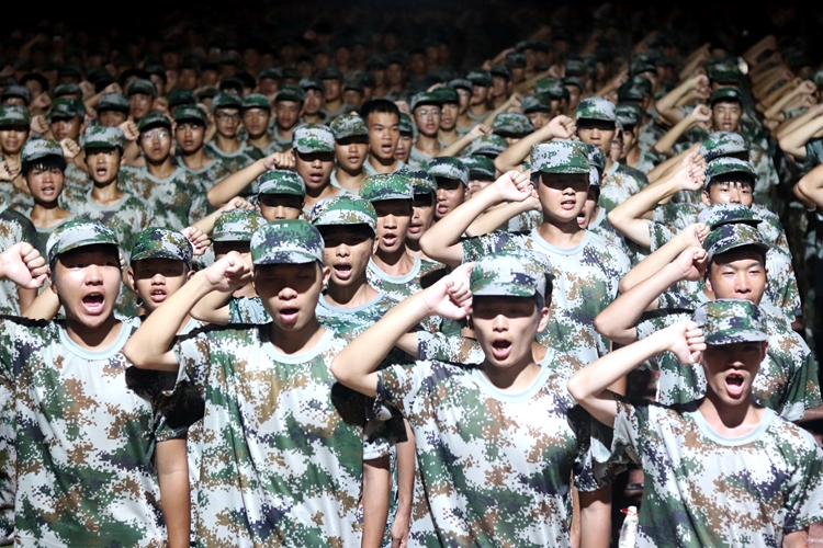 軍訓(xùn)新生面向國旗,以青春之名莊嚴宣誓