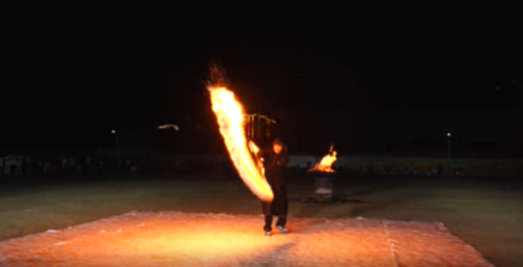 鋒利的火刀在表演者手中被賦予別樣生機,他們熟練地揮舞、翻轉(zhuǎn)火刀,火焰在刀身燃燒跳躍。