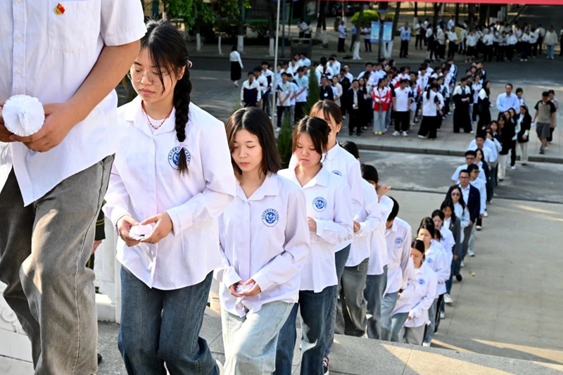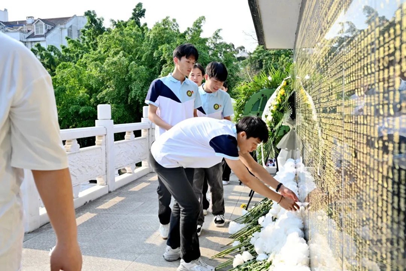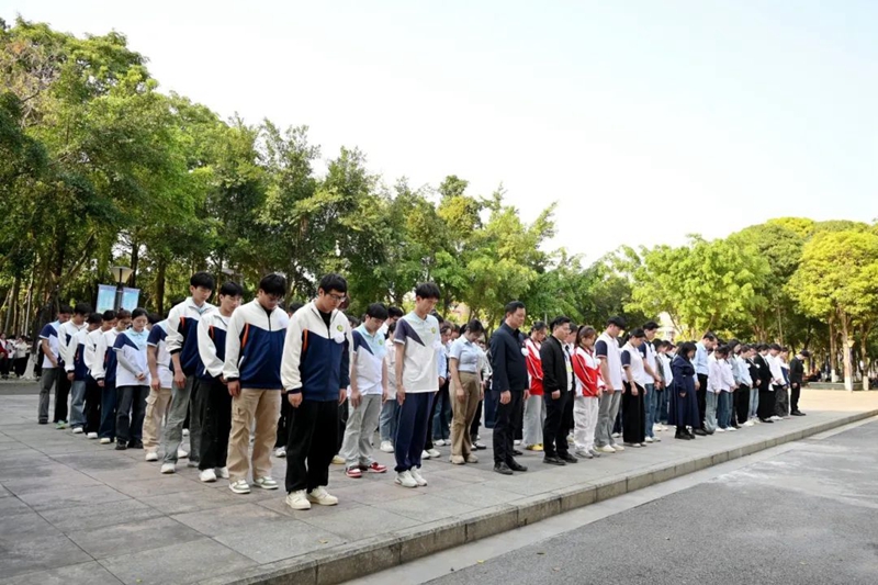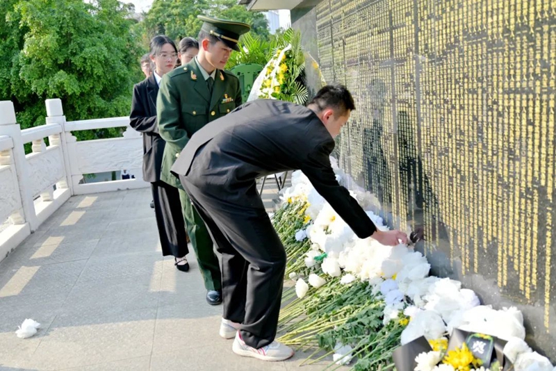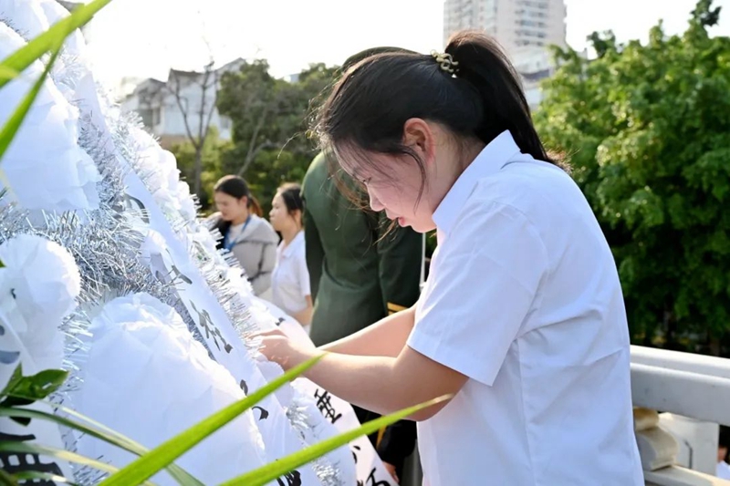 圖為全體師生依次走上瞻仰臺,向革命先烈敬獻(xiàn)小白花