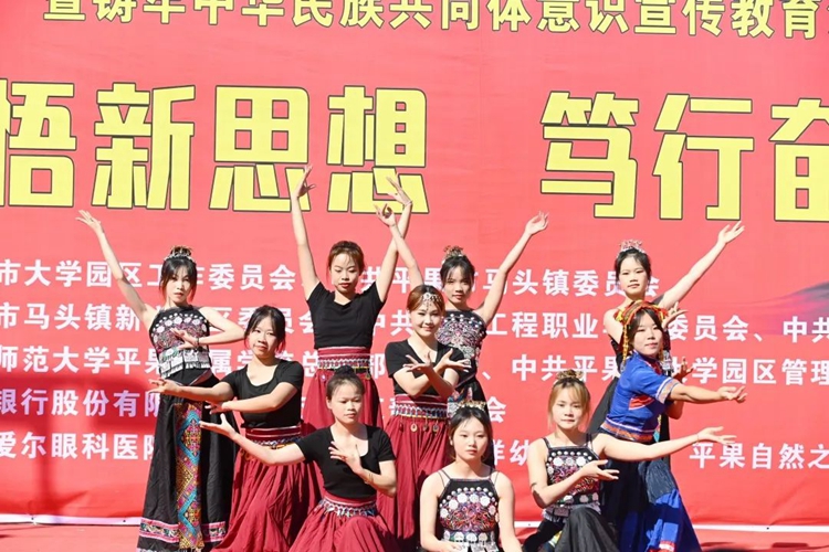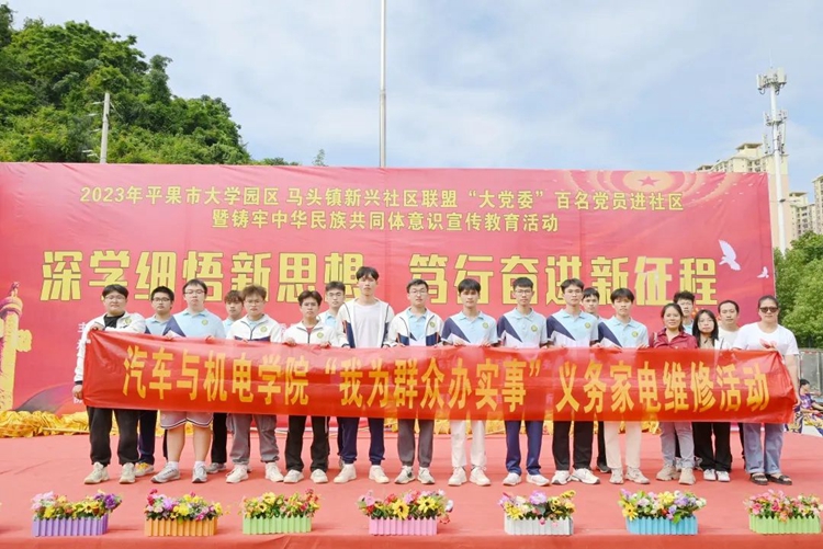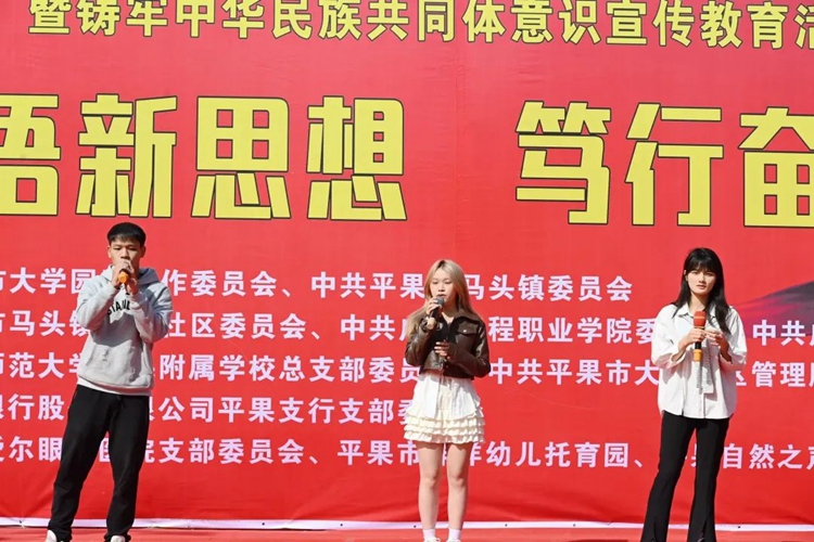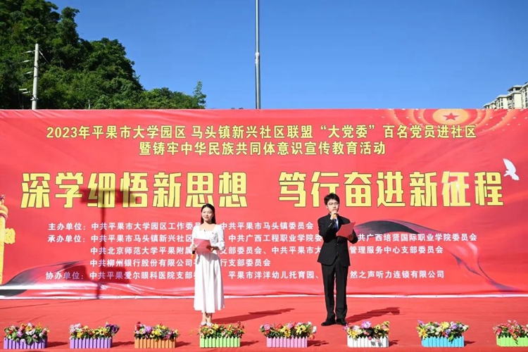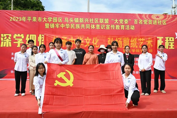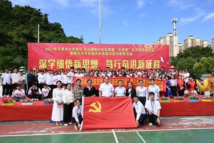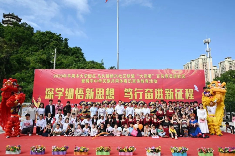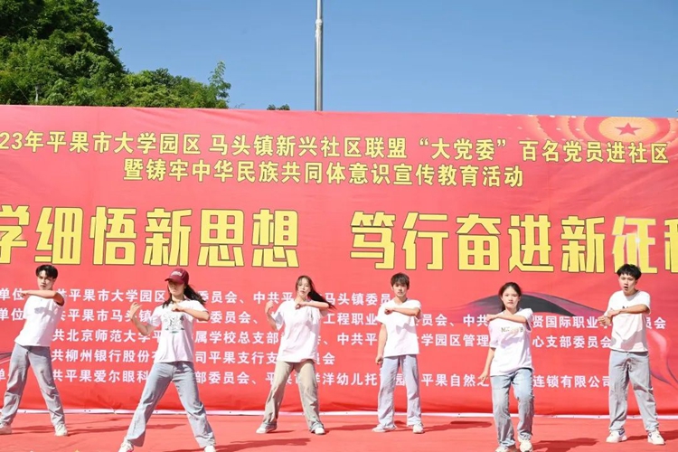 為學思踐悟新思想,以昂揚飽滿的熱忱奮進新征程,推進校社聯(lián)盟“大黨委”活動聯(lián)辦常態(tài)化,扎實開展“我為群眾辦實事”實踐活動,全面推進民族團結(jié)進步事業(yè)的全面發(fā)展,進一步豐富社區(qū)居民的精神文化生活,2023年10月21日,學校黨委組織100多名師生黨員志愿者參加平果市大學園區(qū)與馬頭鎮(zhèn)新興社區(qū)聯(lián)盟“大黨委”開展的“深學細悟新思想 篤行奮進新征程”暨民族團結(jié)進步創(chuàng)建活動,到馬頭鎮(zhèn)新興社區(qū)開展送文藝進社區(qū)、送服務進社區(qū)等民族團結(jié)進步創(chuàng)建系列活動。
