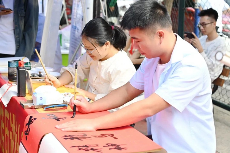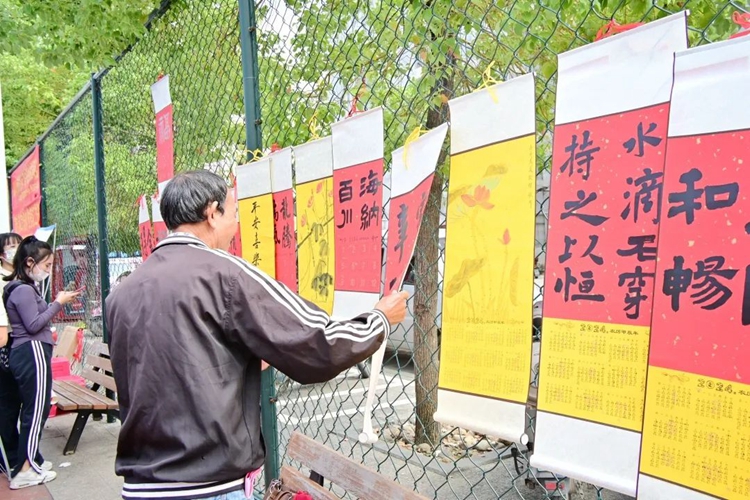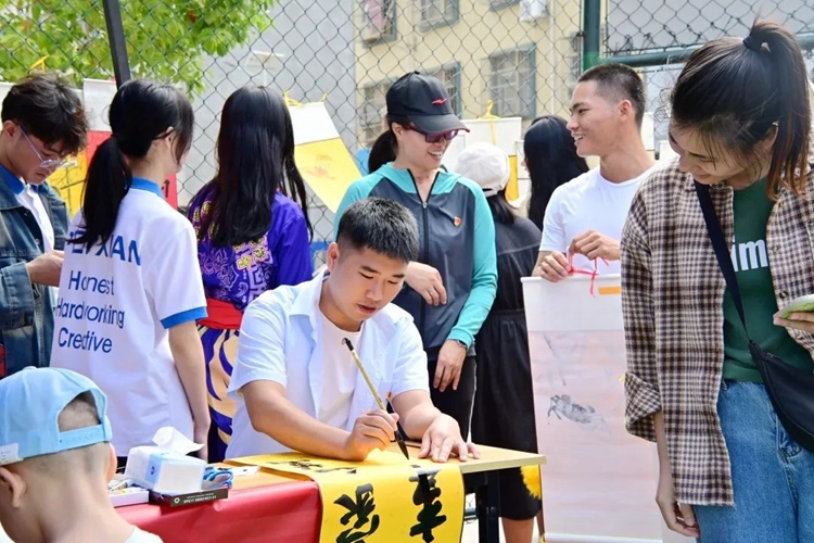 活動現(xiàn)場設置了互動區(qū),提供了書法、繪畫等互動活動,居民們也可以參與到掛歷的書畫創(chuàng)作活動中。整個活動現(xiàn)場氛圍熱烈、溫馨,志愿者們與社區(qū)居民們?nèi)谇⒒?,共同展示了他們的?chuàng)意和文化素養(yǎng),進一步增進了校園與社區(qū)的聯(lián)系,推動民族團結(jié)進步。