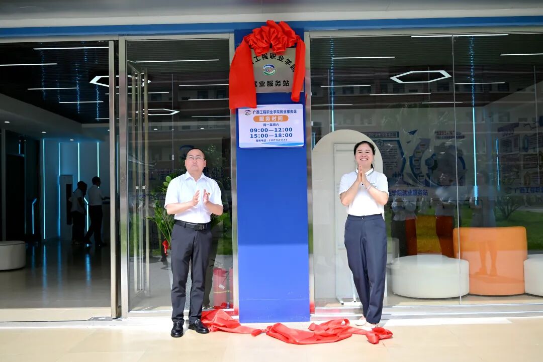在全體與會(huì)領(lǐng)導(dǎo)嘉賓的共同見證下,平果市人社局就業(yè)和人才服務(wù)中心副主任韋柳群與我校紀(jì)委書記、副校長彭高彬共同為廣西工程職業(yè)學(xué)院就業(yè)服務(wù)站揭牌,標(biāo)志著服務(wù)站正式啟用并投入運(yùn)行,學(xué)校就業(yè)服務(wù)工作邁上新臺階。
