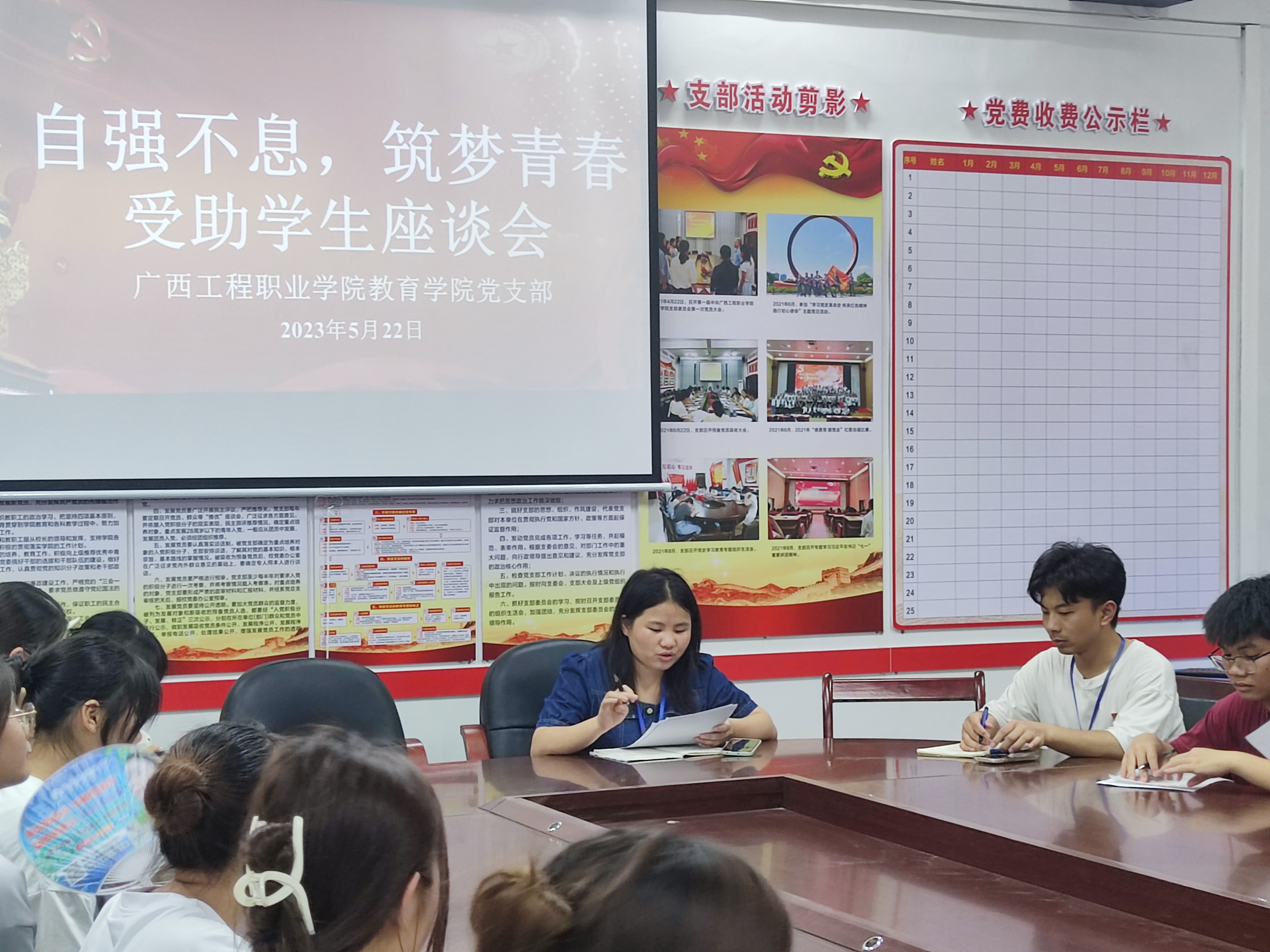 為響應學校開展資助政策宣傳月活動的號召,進一步加強大學生資助政策宣傳力度,實施精準資助,幫助貧困學生安心讀書,培育受助學生的愛黨愛國愛校的情感和感恩意識,確保國家學生資助政策家喻戶曉、深入人心。為了充分發(fā)揮受助學生在學習生活等方面的榜樣作用,激勵更多的同學奮發(fā)向上、爭先創(chuàng)優(yōu),建設更美好的校園。廣西工程職業(yè)學院教育學院黨支部于2023年5月22日在教育學院黨員活動室組織召開“自強不息,筑夢青春”受助學生座談會。