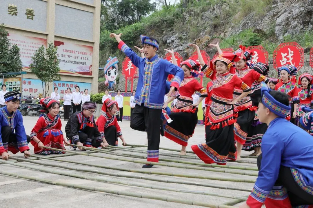竹竿舞,又稱為“打竹舞”或“跳竹舞”,是一種極富節(jié)奏感和韻律感的舞蹈。舞者們?cè)谄叫袛[放的多根竹竿間靈活躍動(dòng),隨著竹竿的開合節(jié)奏變換步伐,展現(xiàn)出高超的技藝和優(yōu)雅的舞姿。竹竿舞不僅考驗(yàn)舞者的身體協(xié)調(diào)性和節(jié)奏感,更是對(duì)團(tuán)隊(duì)協(xié)作和默契的考驗(yàn)。在輕快的竹竿敲擊節(jié)奏中,師生們身著美麗的民族服飾,跳起歡樂的竹竿舞。