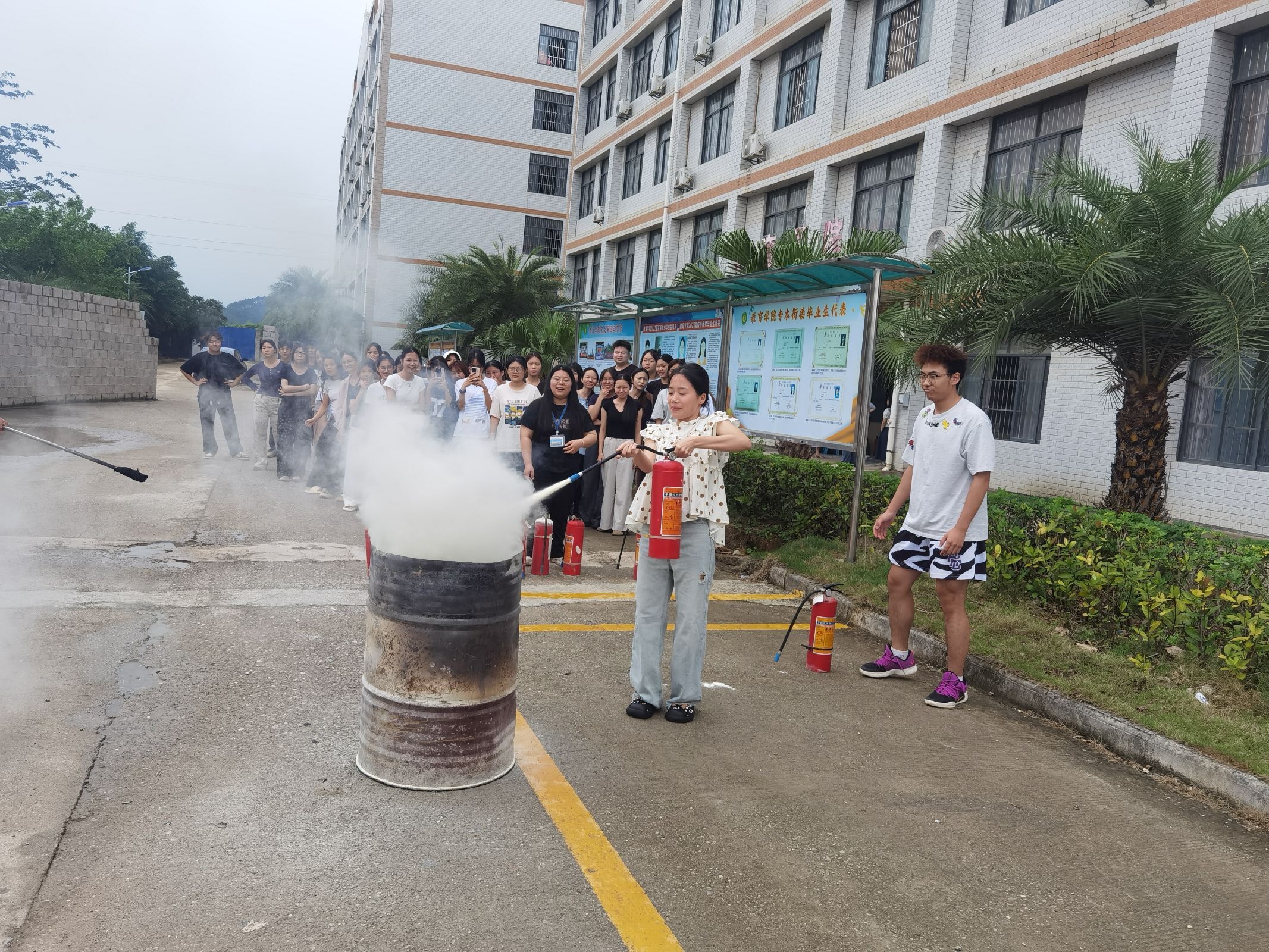 疏散演練結束后,進入消防滅火技能演練環(huán)節(jié)。設備管理員現(xiàn)場講解并演示滅火器、消火栓等消防器材的正確使用方法,詳細介紹火災預防、初期撲救及逃生自救等消防安全知識。隨后,師生們踴躍參與實操,在專業(yè)人員指導下,成功撲滅模擬火源,切實掌握滅火技能。?