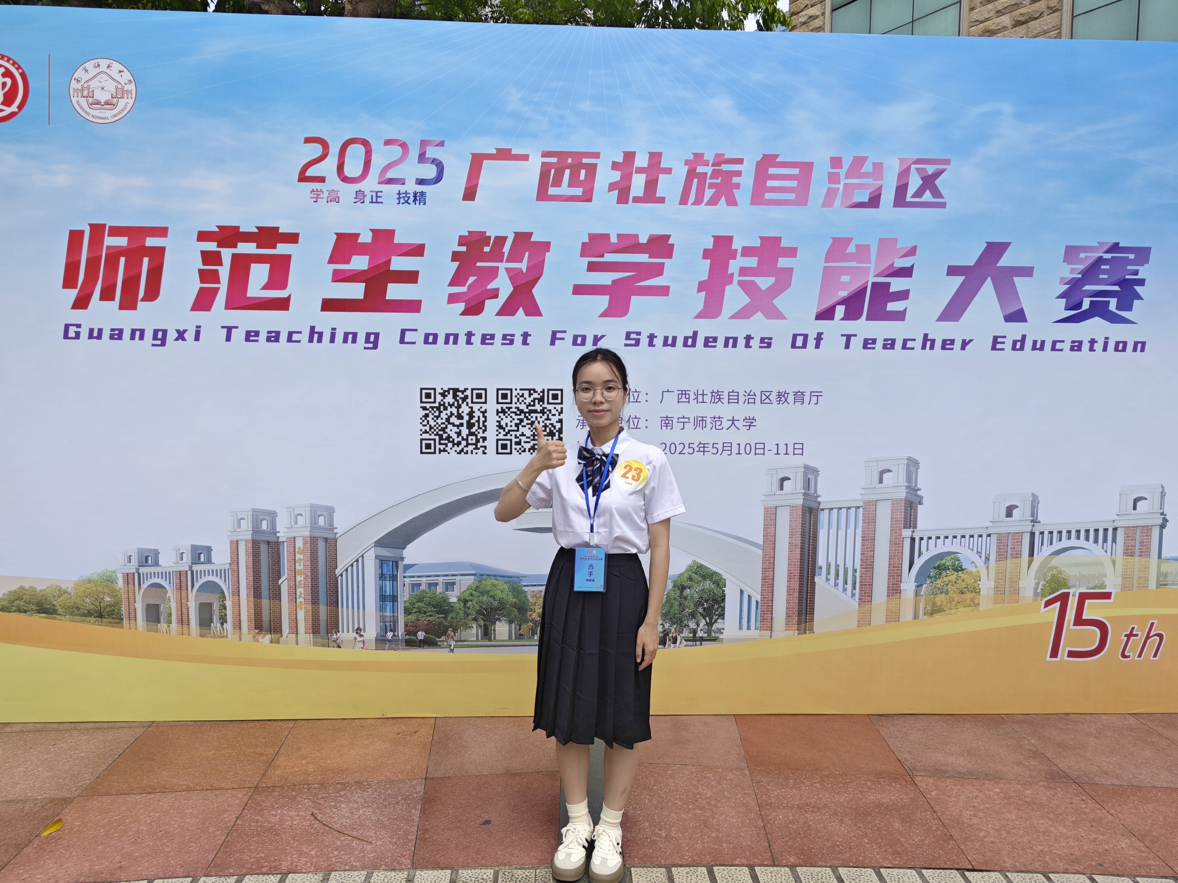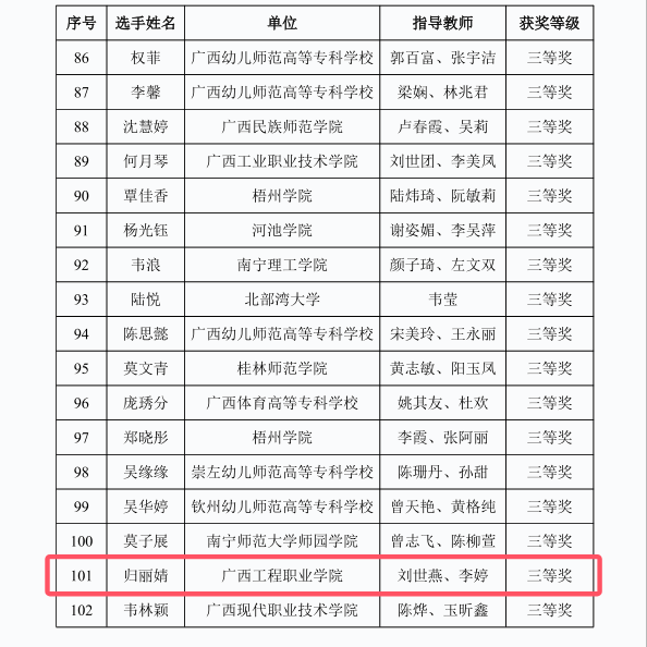近日,2025 年廣西壯族自治區(qū)師范生教學(xué)技能大賽圓滿落幕。我院共派出三名學(xué)子, 分別是李婷、劉世燕老師指導(dǎo)的2023級學(xué)前教育9班學(xué)生歸麗婧;覃小密、何瑞禎老師指導(dǎo)的2023級藝術(shù)教育4班梁思媛;梁善雅、李婷慧老師指導(dǎo)的2023級藝術(shù)教育5班韋煙霞。?