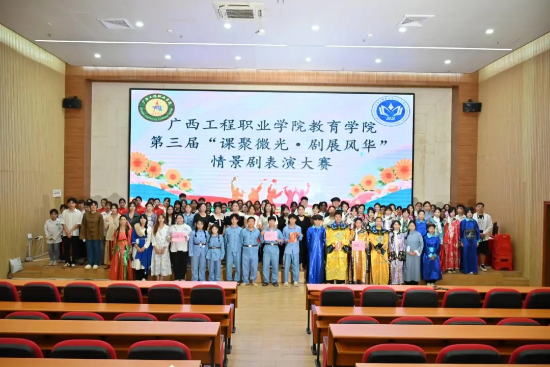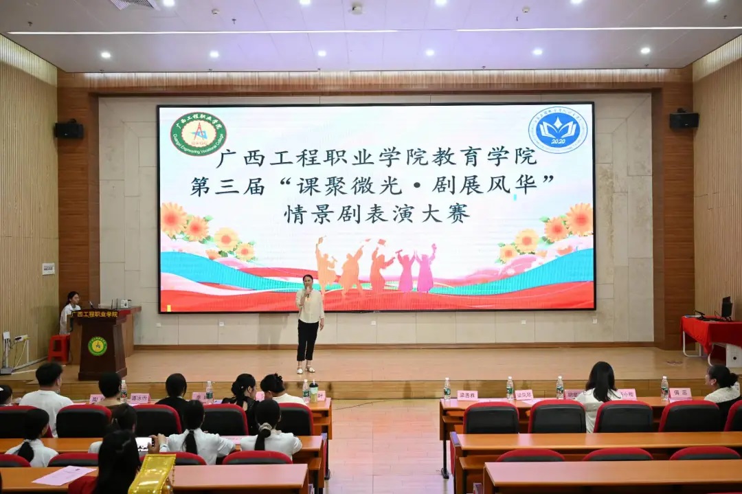 在課堂的方寸之間,我們?cè)c知識(shí)的星辰相遇;在劇本的字里行間,我們?cè)|摸情感的溫度。每一幕情景劇,都是一顆凝聚智慧與創(chuàng)意的微光;每一次演繹,都是一次對(duì)生活與成長(zhǎng)的深情詮釋。2025年5月29日教育學(xué)院在圖文信息大樓一樓學(xué)術(shù)報(bào)告廳開(kāi)展了第三屆“課聚微光,劇展風(fēng)華”情景劇比賽活動(dòng),出席本次活動(dòng)的領(lǐng)導(dǎo)有:校長(zhǎng)助理梁善雅、學(xué)生工作處處長(zhǎng)梁鳳琴、教育學(xué)院院長(zhǎng)胡星萍、黨支部書(shū)記楊小櫻、辦公室主任雷紅、分團(tuán)委書(shū)記佴蕊。擔(dān)任本次比賽的評(píng)委老師有:梁春葉、彭媛、李婷、譚冰雨、陶輝。