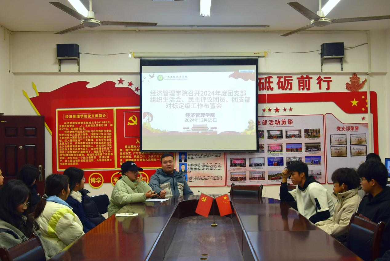 12月25日,經(jīng)濟管理學院在學院302會議室召開了2024年度團支部組織生活會、民主評議團員、團支部對標定級工作布置會,對團員和青年主題教育專題組織生活會和民主評議工作進行全面安排。本次會議由學院分團委書記李東英主持召開。