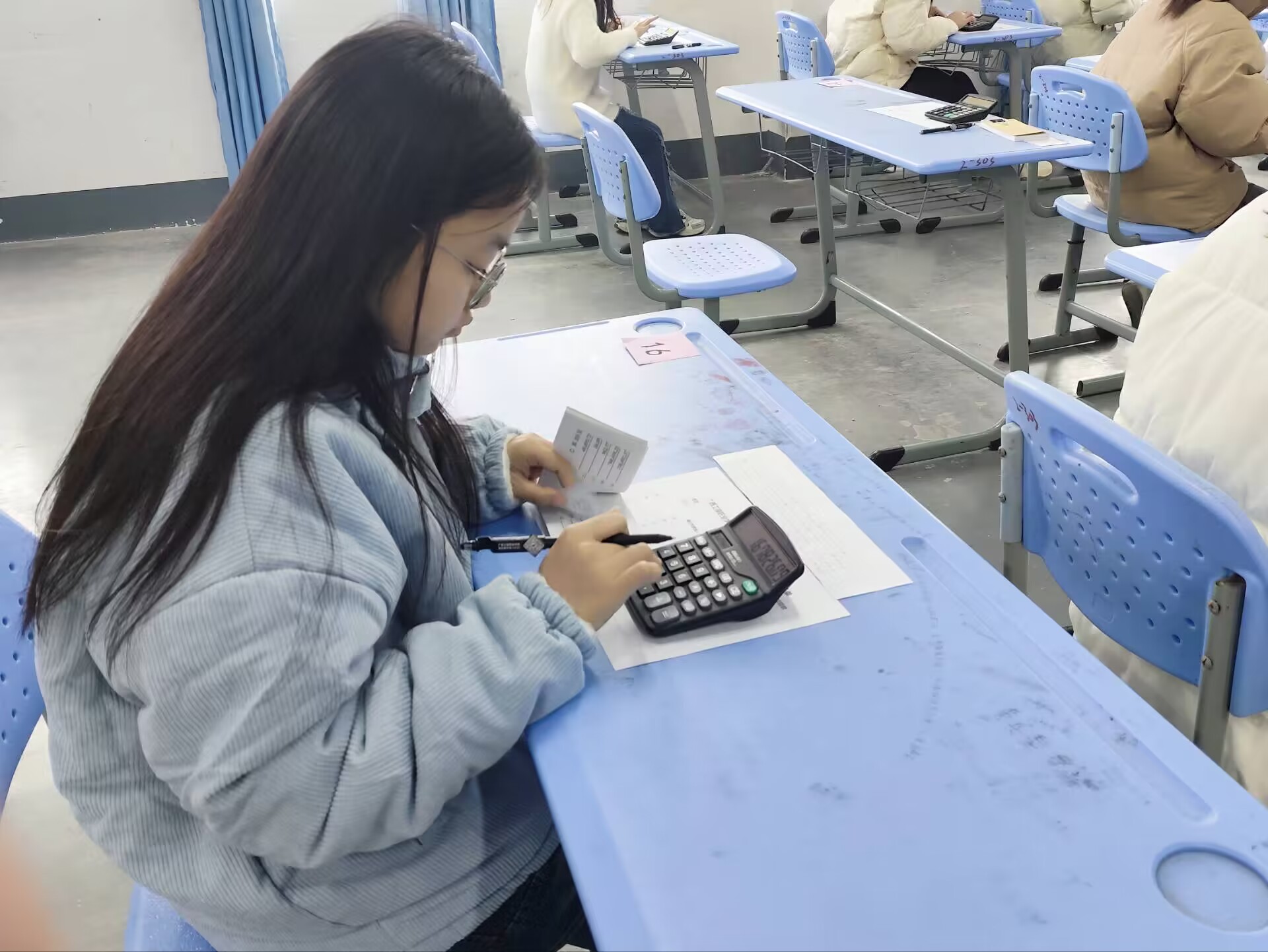 翻打傳票項目中,隨著老師“開始”一聲令下,選手們迅速進入比賽狀態(tài),每位選手都全神貫注地投入比賽當中,目光在傳票和計算器上的數(shù)字之間來回掃視,左手嫻熟地翻動著傳票,右手快速地敲擊著鍵盤上的按鍵,手指快捷、輕靈地游走在各個數(shù)字和符號之間,沒有片刻中斷。比賽現(xiàn)場呈現(xiàn)出職業(yè)競技中專業(yè)而緊張的氛圍。敏捷的反應與熟練的指法,展現(xiàn)出財會學子對職業(yè)技能日益駕輕就熟、嚴謹認真的職業(yè)態(tài)度。