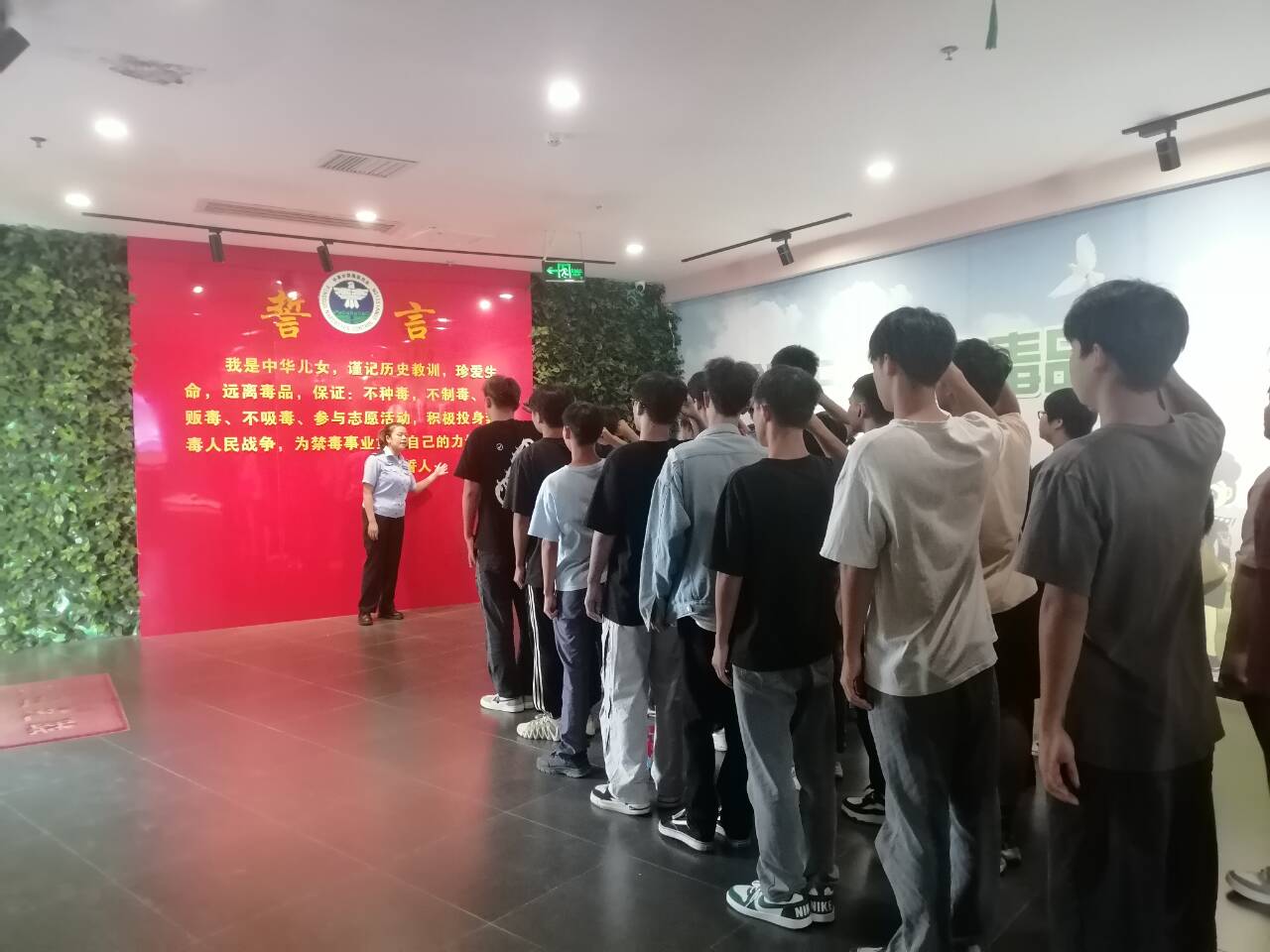 活動(dòng)最后,講解員周老師帶領(lǐng)全體參觀人員進(jìn)行莊嚴(yán)宣誓,堅(jiān)決不沾染毒品并全力支持祖國禁毒工作,積極貢獻(xiàn)自己的一份青春力量!