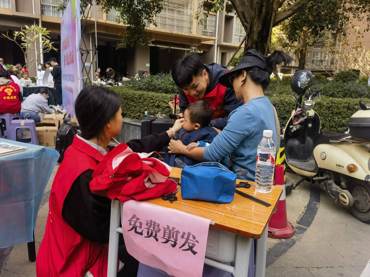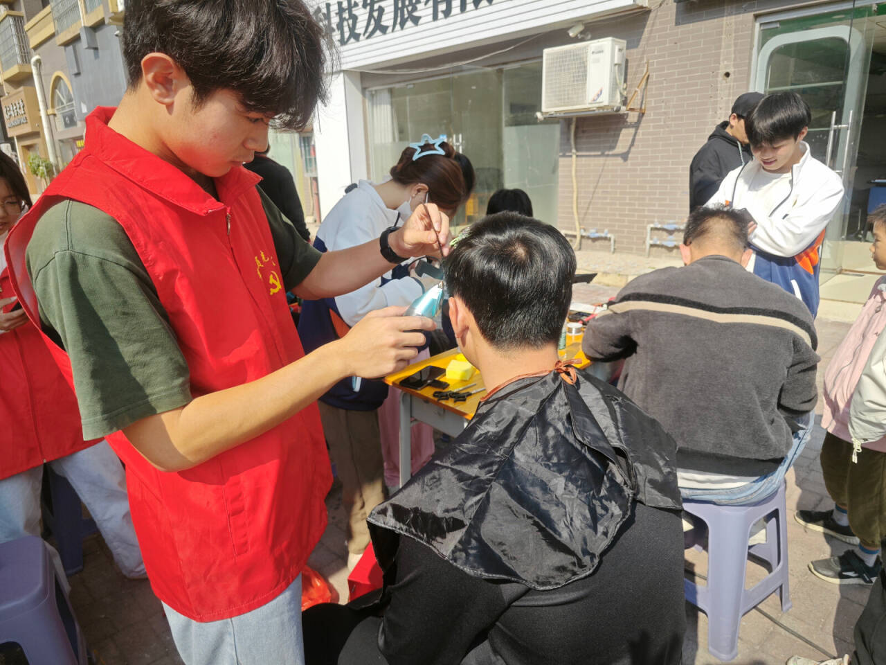 圖為師生們在為社區(qū)群眾義務理發(fā)