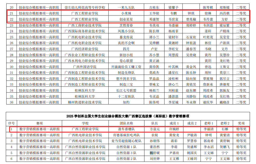 6月27日—28日,2025年第十二屆“學(xué)創(chuàng)杯”全國大學(xué)生創(chuàng)業(yè)綜合模擬大賽廣西賽區(qū)選拔賽(職教組)在柳州職業(yè)技術(shù)大學(xué)舉行,本次選拔賽共有32所高校、500余師生參與競賽。廣西工程職業(yè)學(xué)院經(jīng)濟(jì)管理學(xué)院石娜和徐春陸,鐵道與航空學(xué)院徐琳和韋丹蕾共4位老師帶領(lǐng)2023級大數(shù)據(jù)與會計(jì)專業(yè)黃菲、2023級電子商務(wù)專業(yè)鄭誠、2023級城市軌道交通工程技術(shù)專業(yè)方益元、2023級學(xué)前教育專業(yè)許婉婷等26名同學(xué)參加此次比賽,通過不懈努力,榮獲