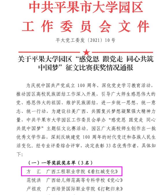 為慶祝中國(guó)共產(chǎn)黨成立100周年,深化黨史學(xué)習(xí)教育活動(dòng),2021年4月由中共平果市大學(xué)園區(qū)工作委員會(huì)舉辦的“感黨恩跟黨走同心共筑中國(guó)夢(mèng)”征文比賽,我院2019級(jí)物業(yè)1班方匯撰寫(xiě)的《紅城變化》在眾多的參賽選手中脫穎而出,榮獲此次征文比賽一等獎(jiǎng),希望廣大師生向獲獎(jiǎng)的同志學(xué)習(xí),發(fā)揮自己的才智,為學(xué)校爭(zhēng)取更多的榮譽(yù)!