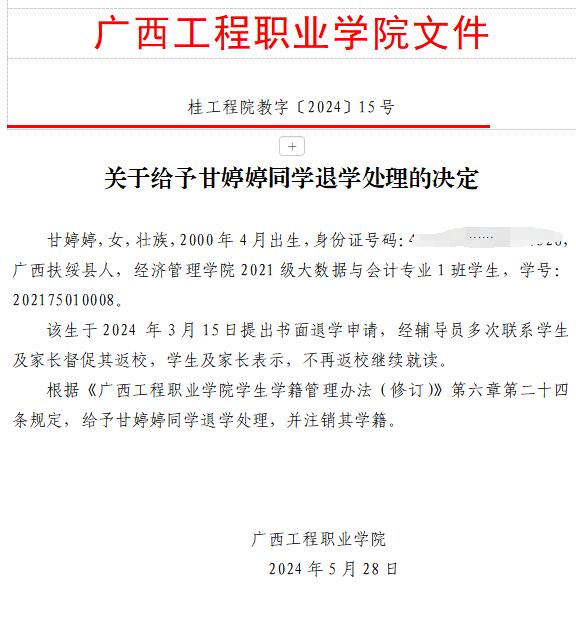 根據(jù)《普通高等學(xué)校學(xué)生管理規(guī)定》(教育部令第41號)、《廣西工程職業(yè)學(xué)院學(xué)生學(xué)籍管理辦法(修訂)》第二十四條規(guī)定,給予甘婷婷同學(xué)退學(xué)處理,并注銷其學(xué)籍。