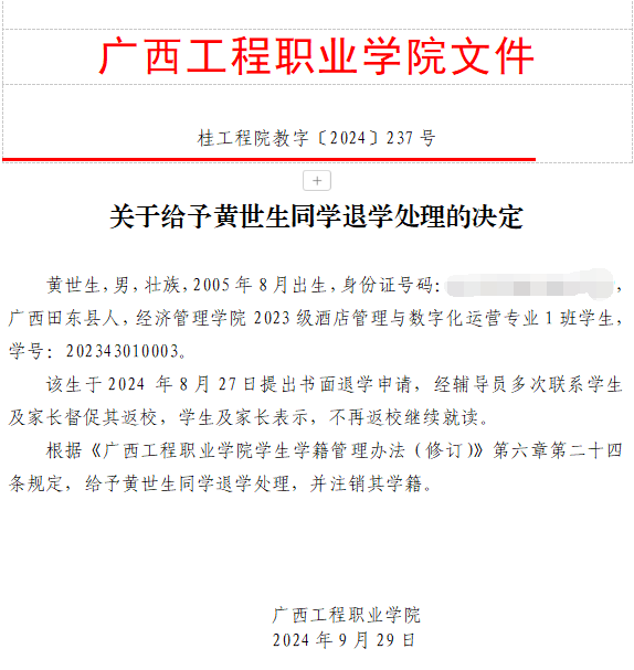 根據(jù)《普通高等學(xué)校學(xué)生管理規(guī)定》(教育部令第41號)、《廣西工程職業(yè)學(xué)院學(xué)生學(xué)籍管理辦法(修訂)》第二十四條規(guī)定,給予黃世生同學(xué)退學(xué)處理,并注銷其學(xué)籍。