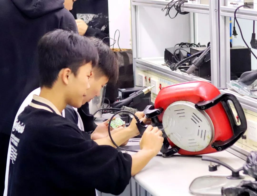 在維修實訓(xùn)室,學(xué)生志愿者們在張軍華老師的指導(dǎo)下,憑著過硬的專業(yè)知識維修家電,以專業(yè)知識為師生辦好事、辦實事、解決生活實際困難和問題。汽車與機電學(xué)院黨支部副書記鄧鎮(zhèn)連也到現(xiàn)場指導(dǎo)維修活動。