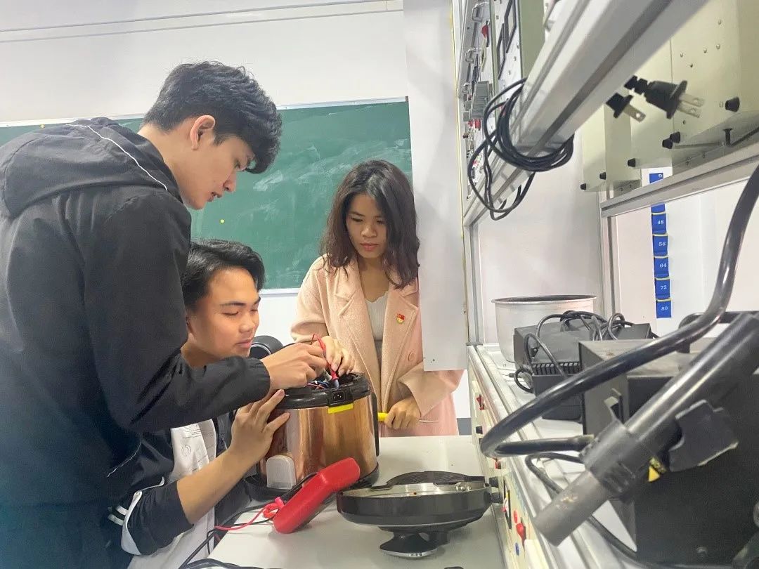汽車與機電學(xué)院黨支部副書記鄧鎮(zhèn)連和指導(dǎo)老師張軍華老師指導(dǎo)學(xué)生維修家電