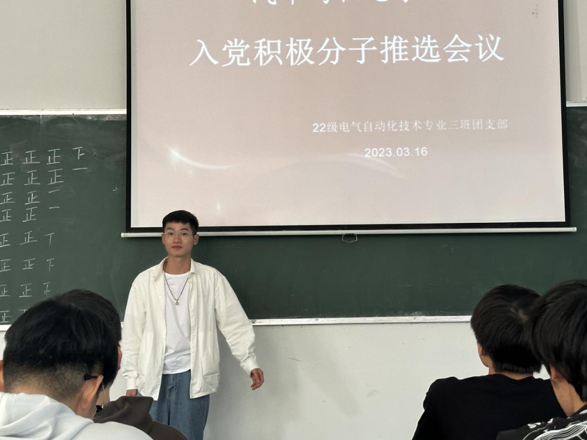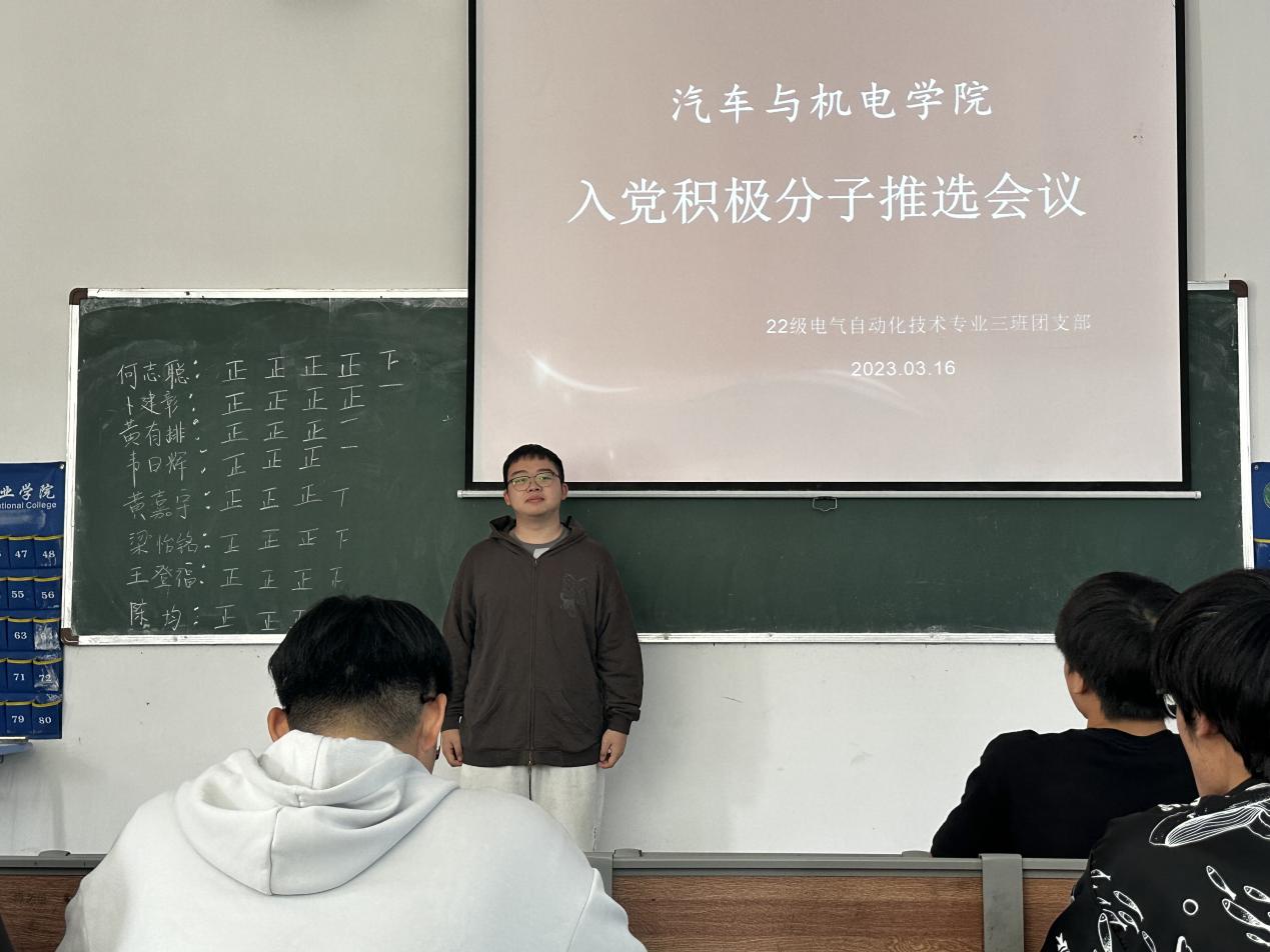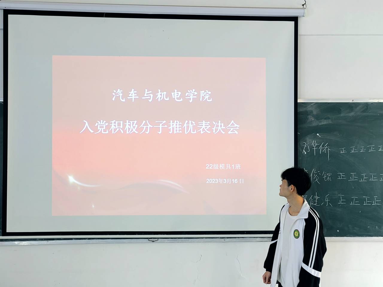 22級模具1班方華僑同學(xué)在推選會議上講解了入黨積極分子推優(yōu)的目的及意義,并宣讀《汽車與機(jī)電學(xué)院入黨積極分子推優(yōu)制度》。