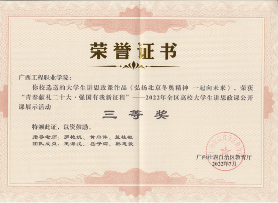 2022年全區(qū)高校大學(xué)生講思政課公開課展示活動三等獎榮譽證書