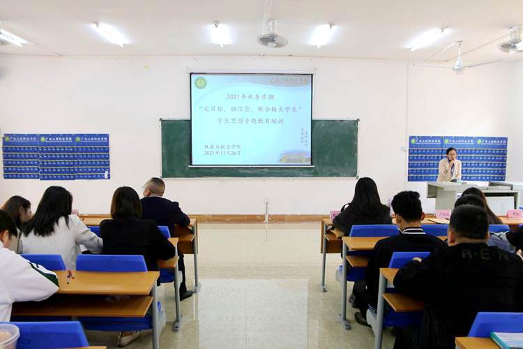 為進(jìn)一步加強(qiáng)大學(xué)生思想政治教育,培育和踐行社會(huì)主義核心價(jià)值觀,促進(jìn)廣大青年在新時(shí)代中主動(dòng)作為、勇?lián)?zé)任,踐行“請(qǐng)黨放心、強(qiáng)國(guó)有我”青春誓言,11月25日下午,學(xué)校鐵道與航空學(xué)院在新經(jīng)管樓102室召開2021年秋季學(xué)期“定目標(biāo),強(qiáng)信念,做合格大學(xué)生”學(xué)生思想專題教育培訓(xùn)。校黨委委員、副校長(zhǎng)彭高彬作專題講座,鐵道與航空學(xué)院黨支部書記、副院長(zhǎng)覃鳳姣,學(xué)生科科長(zhǎng)謝小玲、全體輔導(dǎo)員以及2020級(jí)學(xué)生代表參加培訓(xùn)。