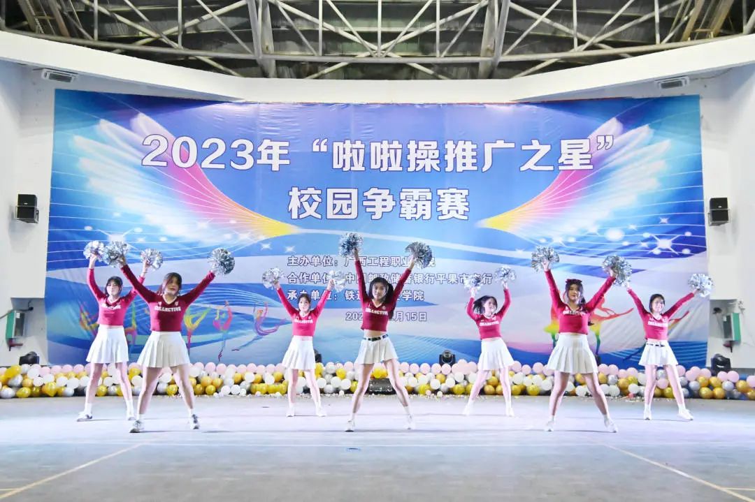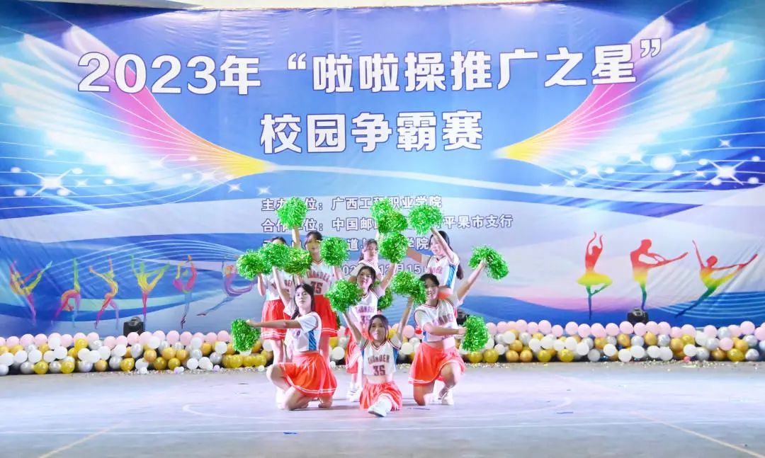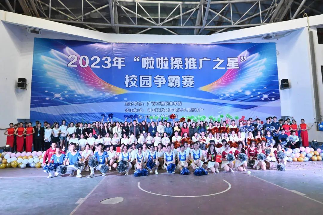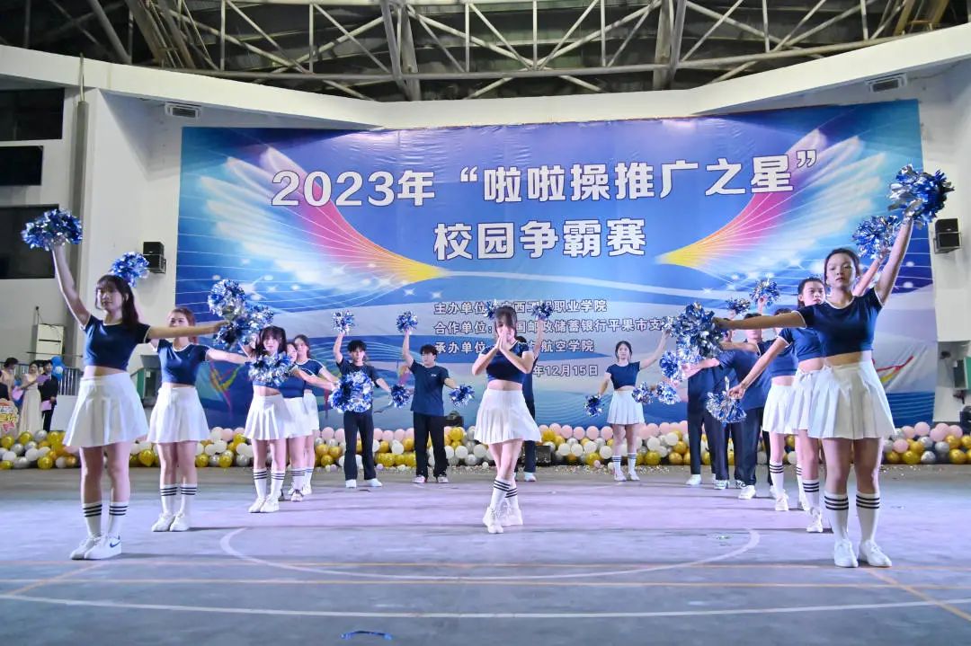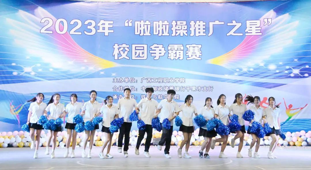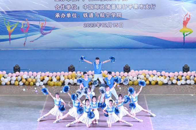 為豐富校園文化生活,展現(xiàn)學(xué)生蓬勃向上的精神風(fēng)貌和青春活力,12月15日,2023年“啦啦操推廣之星”校園爭(zhēng)霸賽在學(xué)校體育館舉行,比賽由廣西工程職業(yè)學(xué)院主辦,中國(guó)郵政儲(chǔ)蓄銀行平果市支行合作共辦,鐵道與航空學(xué)院承辦。學(xué)校紀(jì)委書記、副校長(zhǎng)彭高彬,中國(guó)郵政儲(chǔ)蓄銀行平果市支行行長(zhǎng)羅顯勇,中國(guó)銀行平果市支行行長(zhǎng)馬忺翊,廣西平果順全隆建材有限公司第二分公司總經(jīng)理李宇,鐵道與航空學(xué)院黨支部書記、副院長(zhǎng)廖嬌,鐵道與航空學(xué)院黨支部副書記宋蓉、辦公室主任黃晶晶、分團(tuán)委書記謝小玲,中國(guó)郵政儲(chǔ)蓄銀行平果市支行客戶經(jīng)理呂玲、潘文靜等出席比賽現(xiàn)場(chǎng),學(xué)院全體師生到場(chǎng)觀看比賽。本次比賽由謝錫潔、盧桂玉、顧春盈、黃家歡、蔡富榮五位老師擔(dān)任評(píng)委。共有10支隊(duì)伍參加比賽。