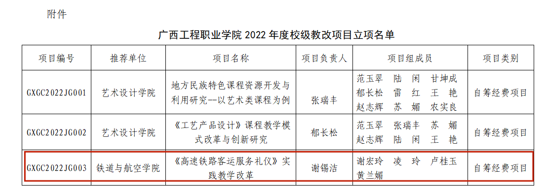 根據(jù)《廣西工程職業(yè)學(xué)院關(guān)于公布2022年度校級教改項目立項名單的通知》(桂工程院〔2023〕7號),我院教師謝錫潔,謝宏玲,凌玲,盧桂玉,黃蘭媚共同研究的教育教學(xué)改革項目—《高速鐵路客運服務(wù)禮儀》實踐教學(xué)改革(編號:GXGC2022JG003)獲得立項。