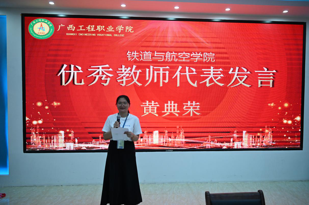 緊接著,優(yōu)秀教師代表黃典榮發(fā)言,她對學校的精心栽培表示衷心的感謝,并如何激發(fā)學生的主動性與創(chuàng)造力以及如何引導學生樹立正確的價值觀和職業(yè)觀兩方面分享了自己的優(yōu)秀教學方法,力求與各位同仁攜手并進,為培養(yǎng)更多高素質技術技能人才貢獻自己的力量。