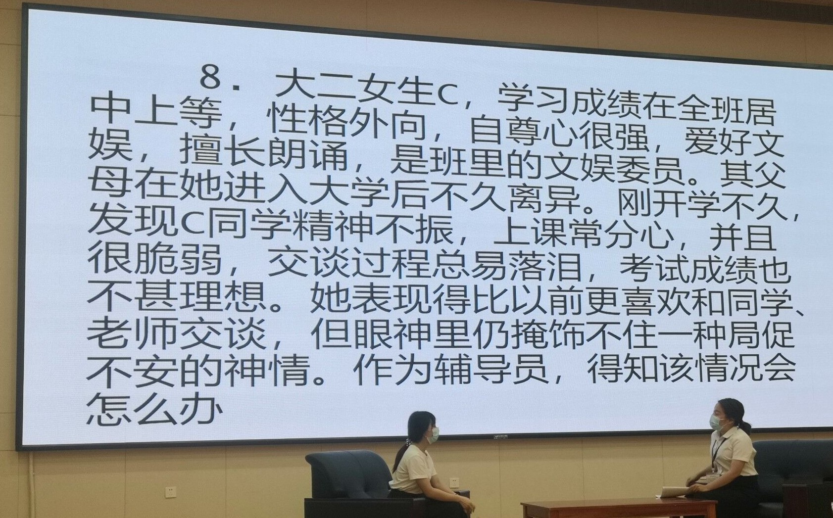 本屆大賽由學生工作處組織開展,大賽分為“基礎(chǔ)知識測試”、“談心談話”、“案例研討”三個環(huán)節(jié)。4月8日下午,進行“基礎(chǔ)知識測試”環(huán)節(jié),此環(huán)節(jié)采用閉卷作答方式進行,限時90分鐘,重點考察輔導員的理論素養(yǎng)和業(yè)務(wù)知識,全方位考核輔導員業(yè)務(wù)基本功。4月9日,分別進行“談心談話”、“案例研討”賽項。